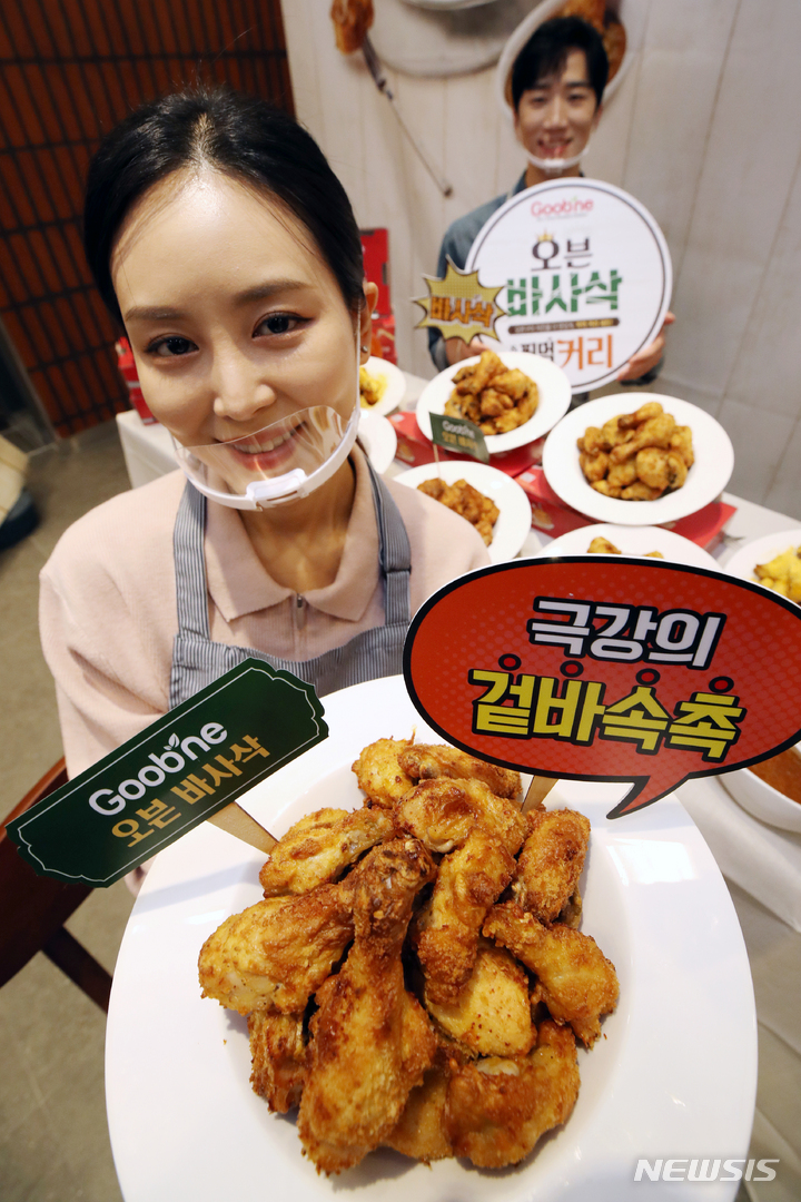 [서울=뉴시스] 조성우 기자 = 26일 오전 서울 종로구 굽네치킨 종각역점에서 모델들이 신제품 '오븐 바사삭'과 '찍먹 커리'를 선보이고 있다. 2022.04.26. [email protected]