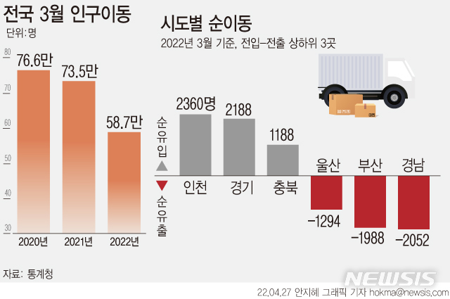 [그래픽] 3월 인구이동 40년 만에 최대 폭↓…부동산 시장 침체 영향