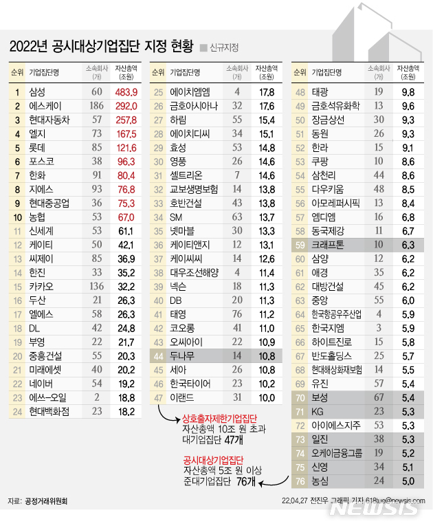 [서울=뉴시스] 공정거래위원회는 오는 5월1일자로 76개 기업집단을 공시대상기업집단으로 지정한다고 25일 밝혔다. 이는 역대 최대 수준으로 지난해와 비교하면 5개 집단이 늘었다. 국내 최대 가상자산 거래소인 업비트를 운영하는 두나무가 대기업으로 지정된다. 가상자산 관련 업무를 주력으로 하는 기업 가운데서는 첫 사례다.  (그래픽=전진우 기자)