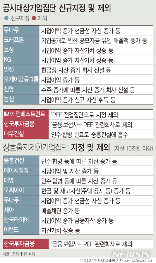 [서울=뉴시스] 가상자산 거래소인 업비트를 운영하는 두나무가 대기업으로 지정된다. 가상자산 관련 업무를 주력으로 하는 기업 가운데서는 첫 사례다. 대우건설은 중흥건설에 인수·합병되면서 대기업집단에서 빠졌다. 한국투자금융은 비금융 계열사들의 지분을 매각하면서 '금융·보험사와 PEF 관련 회사만으로 구성된 기업집단'으로 바뀌었다. (그래픽=안지혜 기자)