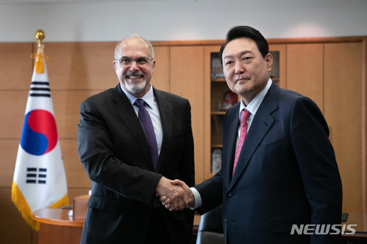 [서울=뉴시스] 인수위사진기자단 = 윤석열 대통령 당선인이 27일 오전 서울 종로구 통의동 대통령직인수위원회 접견실에서 필립 르포르 주한 프랑스 대사를 만나 악수하고 있다. 2022.04.27. [email protected]