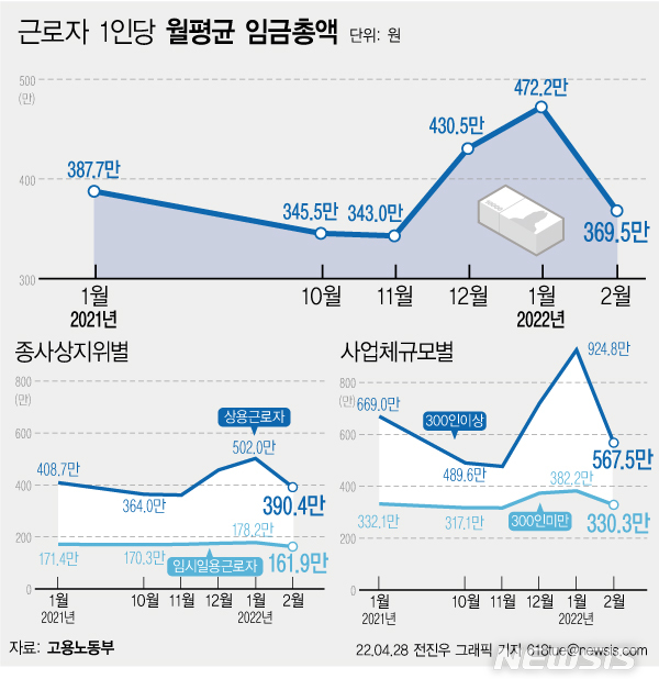 [서울=뉴시스] 27일 고용노동부에 따르면 지난 2월 상용직 1인 이상 사업체의 전체 근로자 1인당 임금총액(세전)은 369만5000원으로, 전년 동월보다 25만5000원(6.5%) 감소했다. (그래픽=전진우 기자)