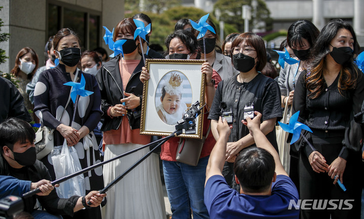 [서울=뉴시스] 정병혁 기자 = 16개월 여아 '정인이'를 학대하고 살해한 혐의로 재판에 넘겨진 양모가 대법원에서 징역 35년을 확정받은 28일 오전 서울 서초구 대법원 앞에서 대한아동학대방지협회 관계자들이 입장을 밝히고 있다. 이날 대법원 3부(주심 김재형 대법관)는 살인 등 혐의로 기소된 양모 장모씨의 상고심에서 징역 35년을 선고한 원심을 확정하고, 함께 재판에 넘겨진 양부 A씨는 징역 5년이 확정했다. 2022.04.28. [email protected]