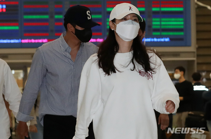 [인천공항=뉴시스] 이영환 기자 = 신혼여행을 마친 배우 현빈과 손예진이 28일 오후 인천국제공항 제2여객터미널을 통해 귀국하고 있다. 2022.04.28. [email protected]