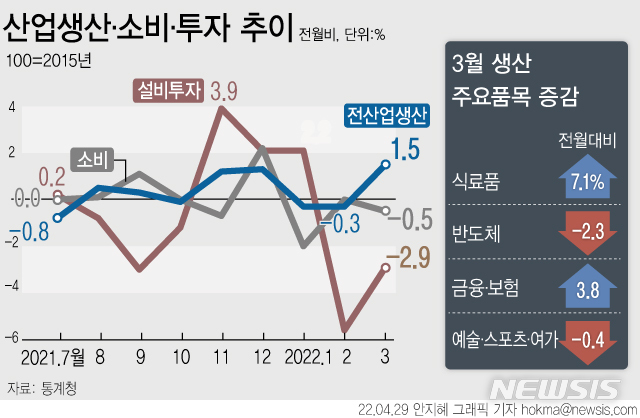 [그래픽] 3월 생산 1.5% 증가…소비·투자는 동반 감소