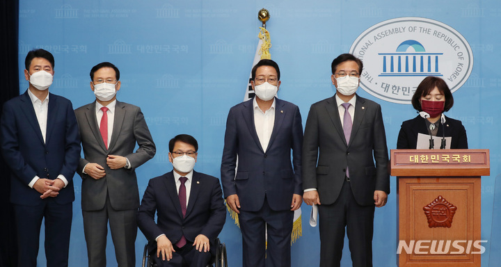 [서울=뉴시스] 최진석 기자 = 국민의힘 송언석(오른쪽 두번째) 원내수석부대표와 양금희(오른쪽) 원내대변인 등 원내부대표단이 29일 국회 소통관에서 합동 기자회견을 하고 있다. 이날 국민의힘 원내대표단은 "민주당이 운영위를 강제소집하는 것은 민심을 정면으로 거스르는 처사로 거센 역풍에 마주하게 될 것"이라고 밝혔다. (공동취재사진) 2022.04.29. [email protected]