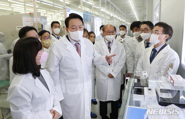 [대전=뉴시스] 인수위사진기자단 = 윤석열 대통령 당선인이 29일 오전 대전 한국과학기술원(KAIST) 내 나노종합기술원을 방문해 반도체 연구 현장을 둘러보던 중 나노기술을 접목한 코로나검사키트에 대한 설명을 듣고 있다. 2022.04.29. photo@newsis,com