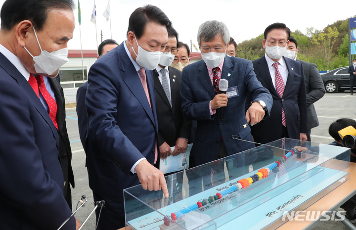 [청주=뉴시스] 인수위사진기자단 = 윤석열 대통령 당선인이 29일 오후 충북 청주 오창 다목적방사광가속기 공사 현장을 방문해 고인수 방사광가속기구축사업단장으로부터 보고를 받고 있다. 2022.04.29. [email protected]