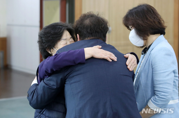 [서울=뉴시스] 홍효식 기자 = 가정의 달을 맞아 요양병원·시설의 한시적 접촉면회가 허용된 30일 오전 서울 성동구 시립동부노인전문요양센터에서 박영순(72세) 어르신이 아들과 만나 포옹하고 있다. 정부는 지난해 11월 18일부터 비접촉 면회만 허용해 왔지만 최근 확진자 발생 감소 추세와 접촉면회 수요를 고려해 이날부터 다음달 22일까지 3주간 한시적으로 변경했다. 2022.04.30. [email protected]