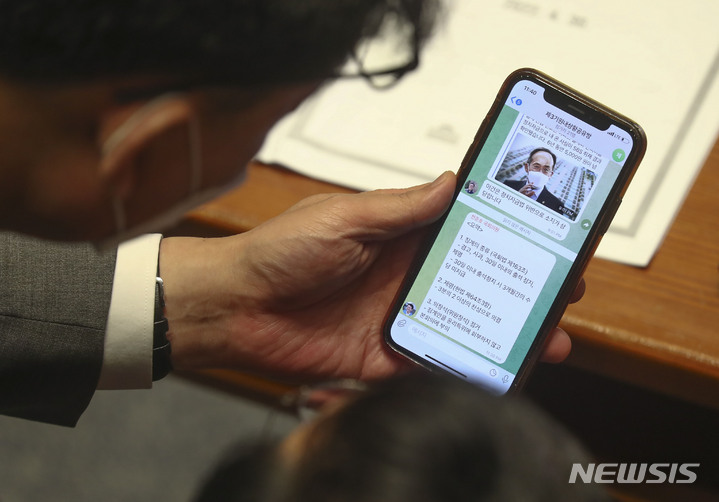 [서울=뉴시스] 전진환 기자 = 30일 영등포구 국회에서 열린 제 396회 임시회 본회의 도중 더불어 민주당 박홍근 원내대표와 진성준 의원이 이야기를 핸드폰으로 추경호 경제부총리 겸 기획재정부장관 후보자 관련 기사를 보며 대화하고 있다. (공동취재사진) 2022.05.01. [email protected]