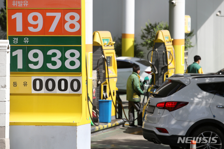 [서울=뉴시스] 조성우 기자 = 유류세 인하 폭이 현행 20%에서 30%로 확대된 1일 오전 서울 시내 한 주유소에 유가정보가 표시되어 있다. 2022.05.01. [email protected]