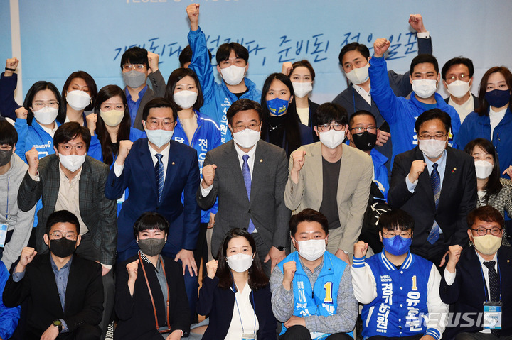 [서울=뉴시스] 고범준 기자 = 윤호중 더불어민주당 공동비대위원장이 1일 국회에서 열린 첫출마지원단 퍼스트펭귄 필승결의대회에서 참석자들과 기념촬영을 하고 있다. (공동취재사진) 2022.05.01. [email protected]