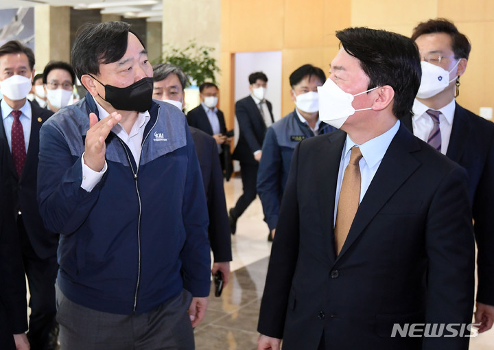 [사천=뉴시스] 인수위사진기자단 = 안철수 대통령직 인수위원장(오른쪽)이 1일 경남 사천시 한국항공우주산업(KAI)에서 열린 우주항공산업 현장간담회에 참석해 안현호 KAI 대표와 대화하고 있다. 2022.05.01. [email protected]