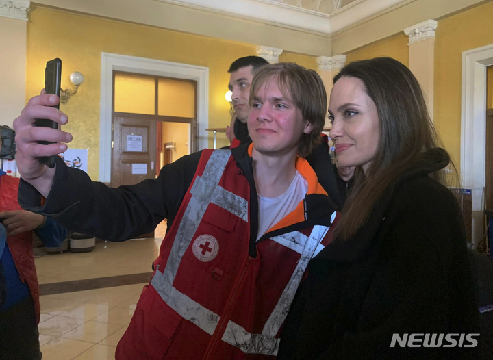 [리비우=AP/뉴시스] 지난달 30일(현지시간) 우크라이나 리비우를 방문한 안젤리나 졸리가 팬과 사진을 촬영하고 있다. 졸리는 전쟁으로 고통받는 아이들을 만나고 부상자들을 돕는 비정부기구(NGO) 활동가들을 격려하기 위해 우크라이나를 방문했다. 2022.05.02
