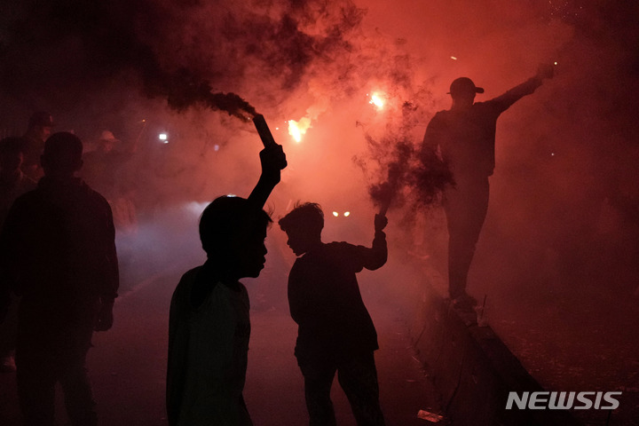 [자카르타=AP/뉴시스] 라마단 종료를 알리는 '이드 알 피트르' 축제 하루 전날인 1일(현지시간) 인도네시아 자카르타에서 사람들이 연막탄을 터트리고 있다. 2022.05.02.