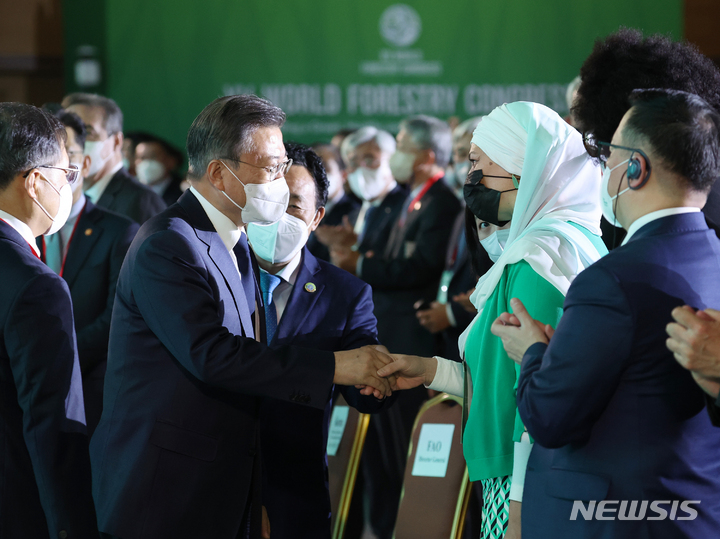 [서울=뉴시스] 전신 기자 = 문재인 대통령이 2일 서울 강남구 삼성동 코엑스에서 열린 제15차 세계산림총회 개회식에 입장하며 홍보대사인 바스마 빈트 알리 요르단 공주와 인사하고 있다. 2022.05.02. [email protected]