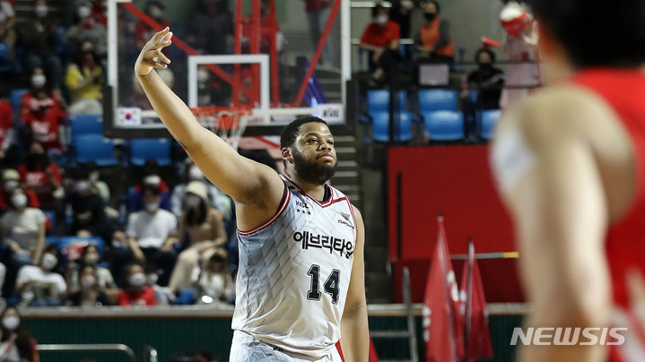 [서울=뉴시스] 이영환 기자 = 2일 오후 서울 송파구 잠실학생체육관에서 열린 2021-2022 프로농구 챔피언결정전 안양 KGC인삼공사와 서울 SK나이츠의 1차전 경기 4쿼터, KGC 오마리 스펠맨이 3점슛을 성공시킨 후 기뻐 하고 있다. 2022.05.02. [email protected]