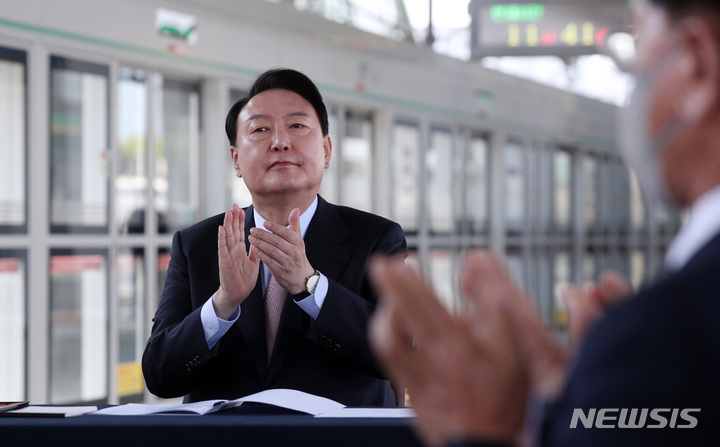 [서울=뉴시스] 인수위사진기자단 = 윤석열 대통령 당선인이 4일 강원 춘천역을 방문해 철도 인프라 구축 현장을 점검하고 있다. 윤 당선인은 GTX-B 노선 춘천 연장과 춘천과 속초를 잇는 동서고속화철도의 조기 완공 등 대선 주요 공약의 이행을 약속하고 현장을 점검했다. 2022.05.04. [email protected]
