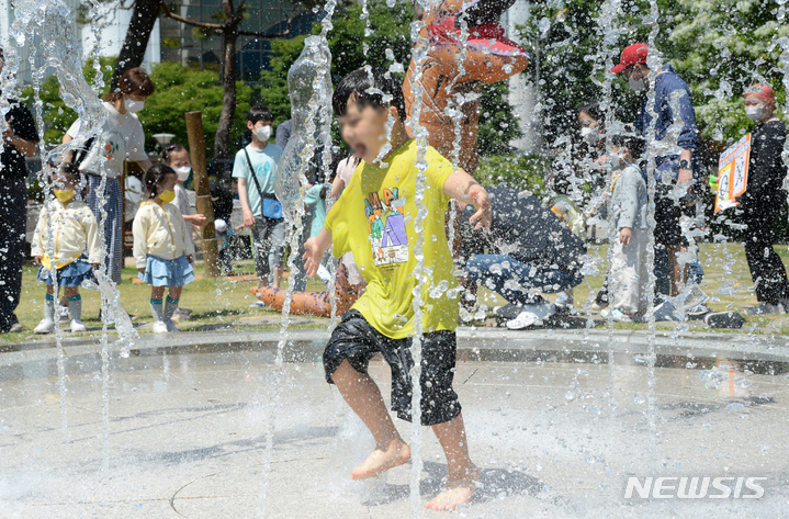 [전주=뉴시스] 김얼 기자 = 제100회 어린이날을 맞이한 5일 전북 전주시 전주시청 노송광장을 찾은 어린이들이 물놀이를 하며 즐거워하고 있다. 2022.05.05. [email protected]