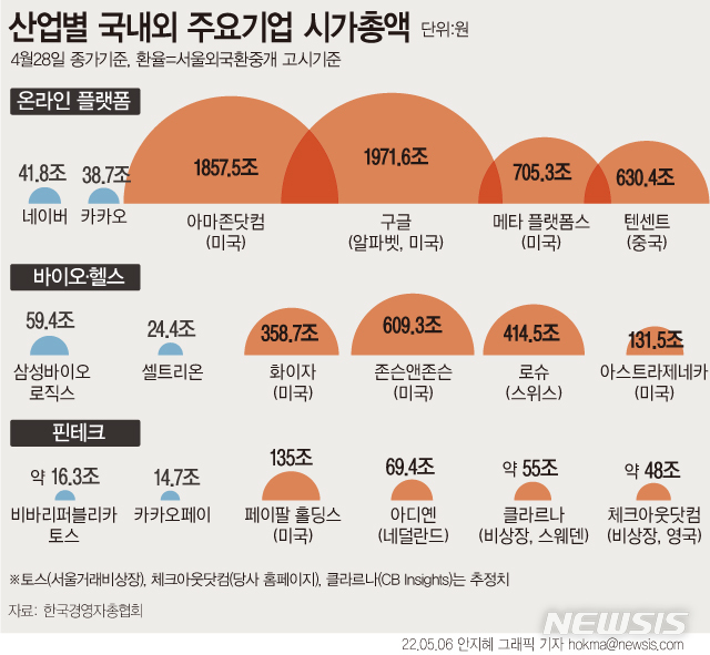 [서울=뉴시스] 6일 한국경영자총협회에 따르면 네이버, 카카오, 삼성바이오로직스, 셀트리온, 카카오페이, 토스 등 3대 신산업(온라인 플랫폼, 바이오·헬스, 핀테크) 국내 6개사 시가총액 합계는 195.3조원이다.