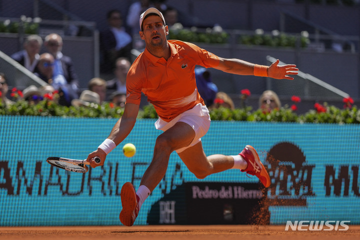 [마드리드=AP/뉴시스] 노바크 조코비치(1위·세르비아)가 6일(현지시간) 스페인에서 열린 남자프로테니스(ATP) 투어 무투아 마드리드 오픈 단식 8강전에서 후베르트 후르카츠(14위·폴란드)와 경기하고 있다. 조코비치가 세트 스코어 2-0(6-3 6-4)으로 승리하며 준결승에 올랐다. 2022.05.07.