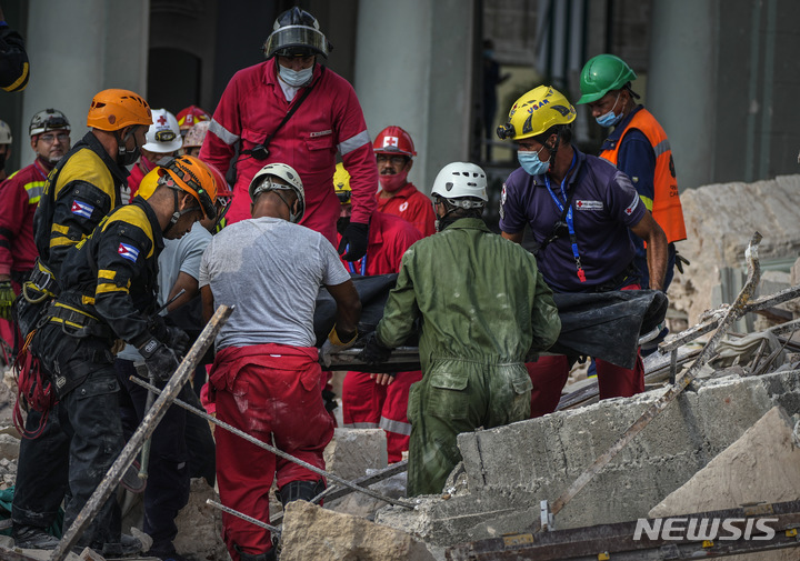 [아바나=AP/뉴시스] 6일(현지시간) 쿠바 수도 아바나의 5성급 호텔 '사라토가' 폭발 현장에서 구조대가 희생자 시신을 수습하고 있다. 가스 누출로 추정되는 강력한 폭발로 임산부와 어린이 등 최소 18명이 숨지고 수십 명이 다쳤다. 폭발 당시 호텔은 공사 중이어서 투숙객은 없었던 것으로 알려졌다. 2022.05.07.