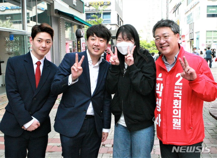 [원주=뉴시스] 이덕화 기자 = 7일 원강수 국민의힘 원주시장 예비후보 선거사무소 개소식에 참석한 이준석 당 대표가 "원강수 원주시장 후보, 김진태 강원도지사 후보, 박정하 원주갑 국회의원 보궐선거 후보에게 소중한 한표를 부탁드린다"며 무실동 상가 주변의 시민들을 만나고 있다. 2022.05.07. [email protected]