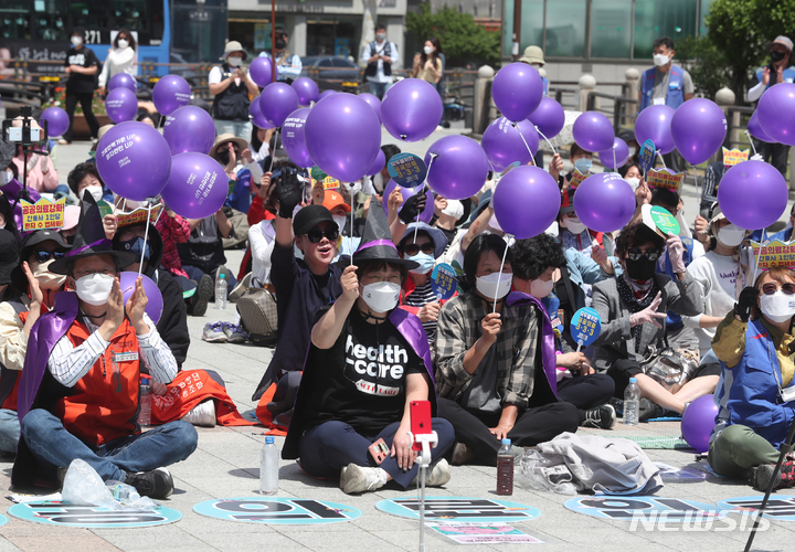 [서울=뉴시스] 고승민 기자 = 7일 서울 보신각 앞에서 공공운수노조 의료연대본부 등 주최로 열린 국제간호사의날 기념 문화제에서 참가자들이 간호사 처우개선 등을 촉구하며 구호를 외치고 있다. 2022.05.07. [email protected]
