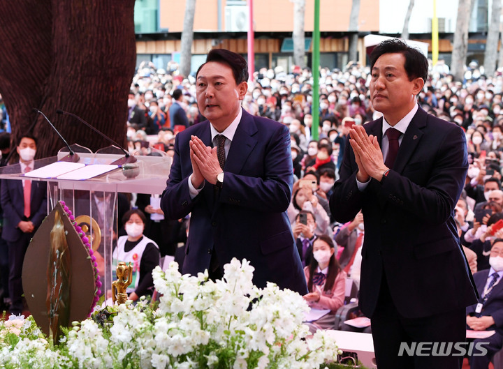 [서울=뉴시스] 인수위사진기자단 = 윤석열(왼쪽) 대통령 당선인과 오세훈 서울시장이 8일 오전 서울 종로구 조계사에서 열린 '불기2566년 부처님 오신날 법요식'에 참석해 헌촉한 뒤 합장하고 있다. 2022.05.08. [email protected]