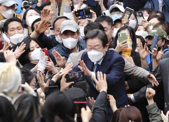 [서울=뉴시스] 국회사진기자단 = 이재명 더불어민주당 상임고문이 8일 인천 계양산 야외공연장에서 열린 국회의원 보궐선거(인천 계양을) 출마 선언 기자회견에서 지지자들과 인사하고 있다. 2022.05.08. [email protected]
