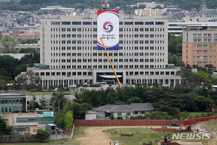 [서울=뉴시스] 백동현 기자 = 제20대 대통령 취임식을 이틀 앞둔 8일 오후 서울 용산구 대통령실 청사에 현수막이 걸려 있다. 2022.05.08. [email protected]