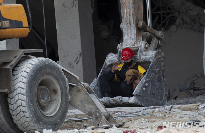 [아바나=AP/뉴시스] 8일(현지시간) 쿠바 수도 아바나의 5성급 호텔 사라토가 폭발 현장에서 한 구조대원이 수색견과 함께 중장비에 올라 수색에 투입되고 있다. 지난 6일 발생한 이 호텔 폭발 사고로 사망자 숫자는 최소 27명으로 늘어났고 부상자도 90명에 달하는 것으로 알려졌다. 2022.05.09.