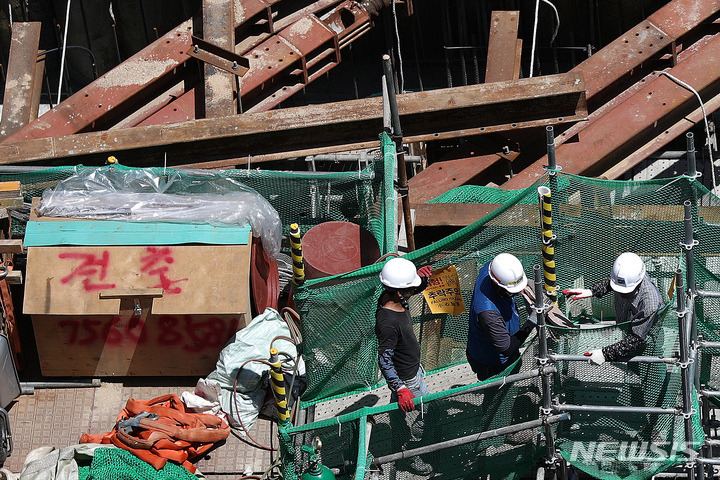 [서울=뉴시스] 백동현 기자 = 최근 시멘트, 철근 등 건설 원자재 가격 상승으로 공사 중단 대란이 우려되고 있다. 수도권 철근콘크리트 연합회는 하도급 대금 20% 인상 요구를 건설업체들이 수용하지 않을 경우 오는 11일 공사 중단 여부를 결정하겠다고 밝혔다. 사진은 9일 오후 서울 시내 한 공사현장에서 근로자들이 작업하고 있는 모습. 2022.05.09. [email protected]