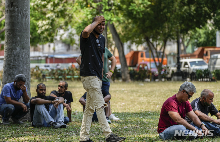 [아바나=AP/뉴시스] 9일(현지시간) 쿠바 아바나 5성급 호텔 폭발 현장 부근에서 실종자 가족인 한 남성이 답답한 표정으로 수색 소식을 기다리고 있다. 지난 6일 발생한 이 호텔 폭발로 최소 27명이 숨지고 90명이 다친 것으로 나타났다. 2022.05.10.