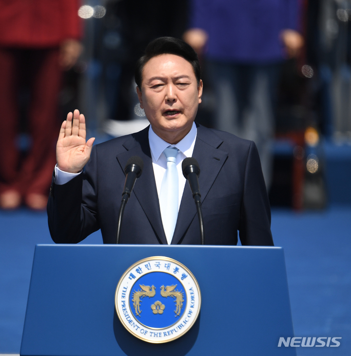 [서울=뉴시스] 김선웅 기자 = 윤석열 대통령이 10일 오전 서울 여의도 국회에서 열린 제20대 대통령 취임식에서 취임선서를 하고 있다. (공동취재사진) 2022.05.10. [email protected]