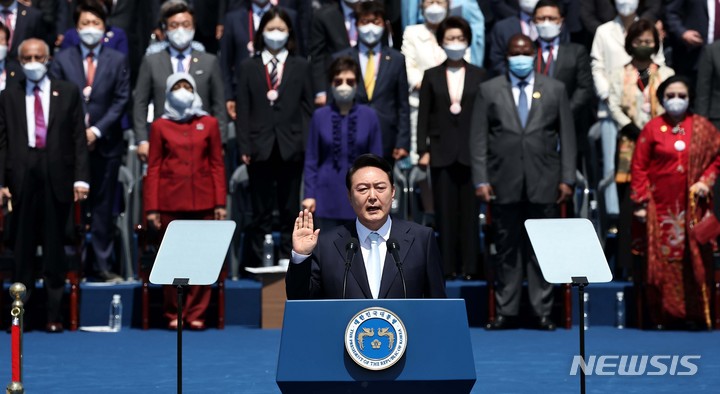 [서울=뉴시스] 김선웅 기자 = 윤석열 대통령이 10일 국회에서 열린 제 20대 대통령 취임식에서 취임 선서를 하고있다. (공동취재사진) 2022.05.10. [email protected]