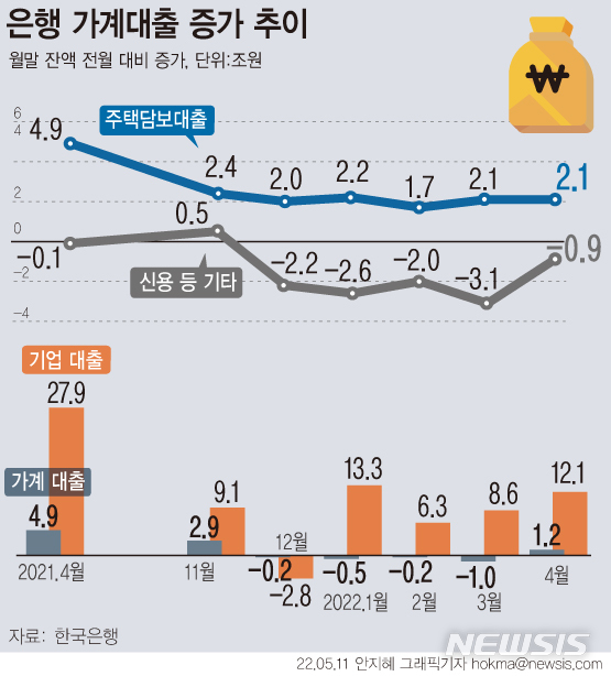 [서울=뉴시스] 대출금리 인상에도 불구하고 은행권 가계대출이 주택담보대출을 중심으로 늘고 신용대출의 감소세가 둔화되면서 5개월 만에 증가 전환했다. 기업대출은 전월 말 대비 12조1000억원 늘어난 1106조원으로 집계돼 4개월 연속 증가했다. (그래픽=안지혜 기자)