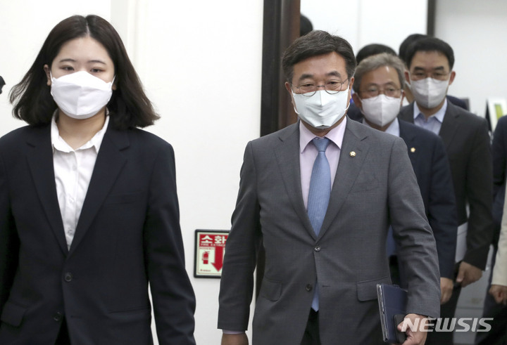[서울=뉴시스] 최진석 기자 = 박지현(왼쪽), 윤호중 더불어민주당 공동비상대책위원장을 비롯한 지도부가 11일 오전 서울 여의도 국회에서 열린 더불어민주당 비상대책위원회의에 참석하고 있다. (공동취재사진) 2022.05.11. [email protected]