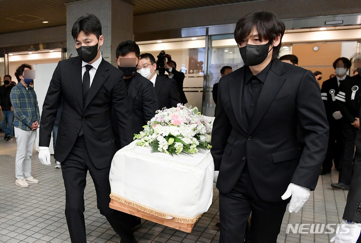 [서울=뉴시스] 고승민 기자 = 11일 서울 강남구 삼성서울병원 장례식장에서 영화배우 고 강수연의 영결식 발인이 엄수되고 있다. 배우 정우성, 설경구가 운구를 하고 있다. (공동취재사진) 2022.05.11. [email protected]