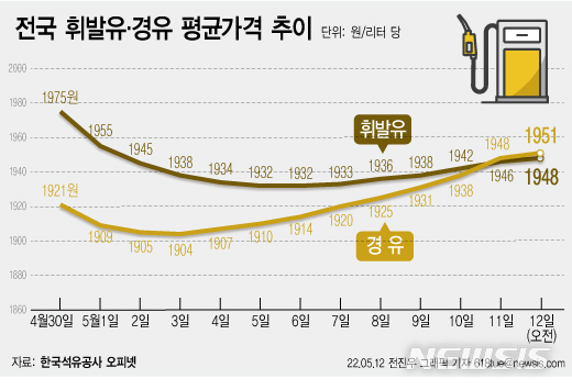[그래픽] 휘발유 넘어선 경유가격…리터당 1950.78원