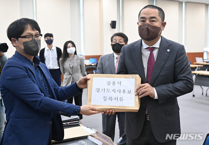 [수원=뉴시스] 김종택기자 = 강용석 무소속 경기도지사 후보가 12일 오전 후보자 등록을 하기 위해 경기도 수원시 영통구 경기도선거관리위원회에서 후보자 등록을 하고 있다. 2022.05.12. [email protected]