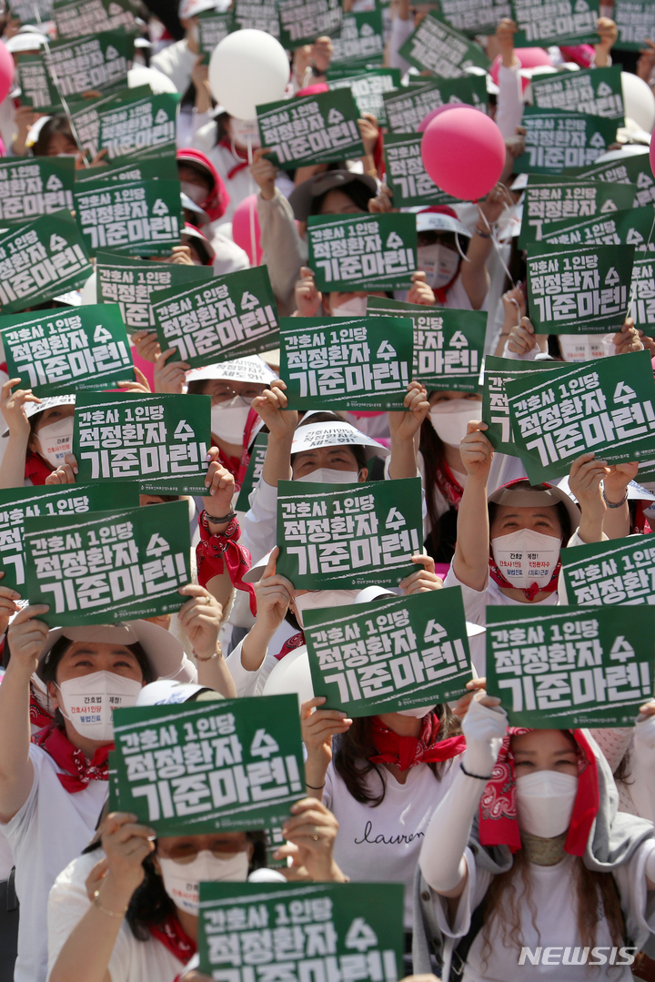[서울=뉴시스] 조성우 기자 = 대한간호협회와 전국보건의료노조 조합원들이 12일 오후 서울 종로구 광화문 동화면세점 앞에서 열린 2022 국제 간호사의 날 결의대회에서 간호법 제정, 간호사 1인당 적정 환자 수 기준 마련, 불법진료(의료) 근절 등을 요구하며 구호를 외치고 있다. 2022.05.12. [email protected]
