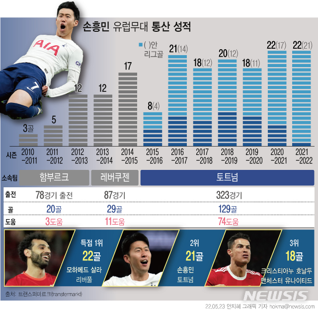 [서울=뉴시스] 손흥민(30·토트넘)은 13일(한국시간) 아스널과의 2021~2022시즌 EPL 22라운드 순연 경기에서 리그 21호골에 성공하며, 자신의 한 시즌 정규리그 최다 득점 행진을 이어갔다. 또 EPL 득점 선두인 모하메드 살라(22골 리버풀)를 단 1골 차로 맹추격했다.