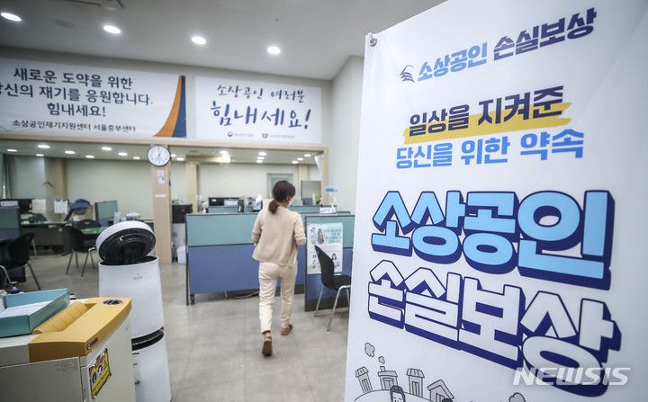 [서울=뉴시스] 정병혁 기자 = 지난 12일 윤석열 대통령 취임 후 열린 첫 임시국무회의에서 추가경정예산안을 심의, 의결했다. 코로나19로 피해를 본 자영업자·소상공인은 손실보상금으로 최소 600만원에서 최대 1000만원까지 지급하기로 했다. 13일 오후 서울 종로구 소상공인진흥공단 서울중부센터에 소상공인 손실보상 관련 안내 배너가 설치되어 있다. 2022.05.13. [email protected]