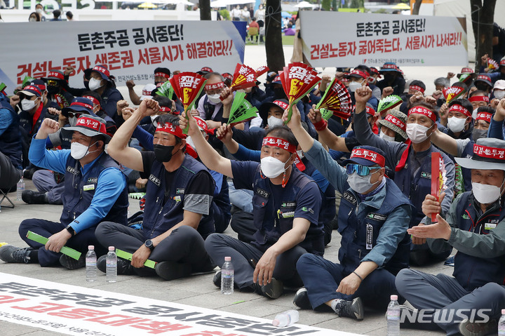 [서울=뉴시스] 최동준 기자 = 민주노총 전국건설노동조합 서울경기북부건설지부가 13일 서울 중구 서울시청 앞에서 건설 노동자 생존권 보장 결의대회를 열고 둔촌 주공 아파트 공사재개 촉구 및 체불임금 지급을 촉구하고 있다. 2022.05.13. [email protected]