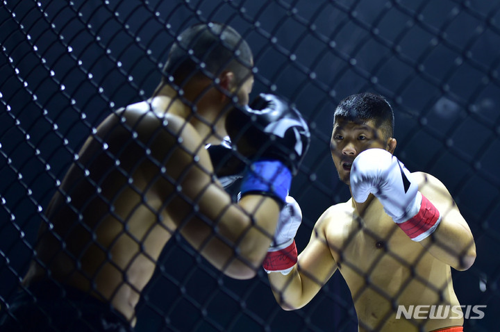 [대구=뉴시스] 이무열 기자 = 14일 오후 대구 북구 대구체육관에서 열린 ‘굽네 로드FC 060’ 복싱 스페셜 매치 경기에 출전한 남의철과 권아솔이 격돌하고 있다. 2022.05.14. [email protected]