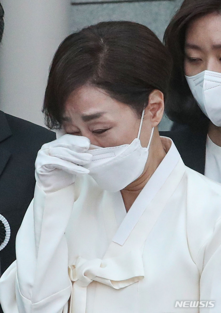 [서울=뉴시스] 권창회 기자 = 구지은 아워홈 부회장이 15일 오전 서울 송파구 서울아산병원 장례식장에서 엄수된 故 구자학 아워홈 회장 영결식에서 눈물을 닦고 있다. 2022.05.15. [email protected]
