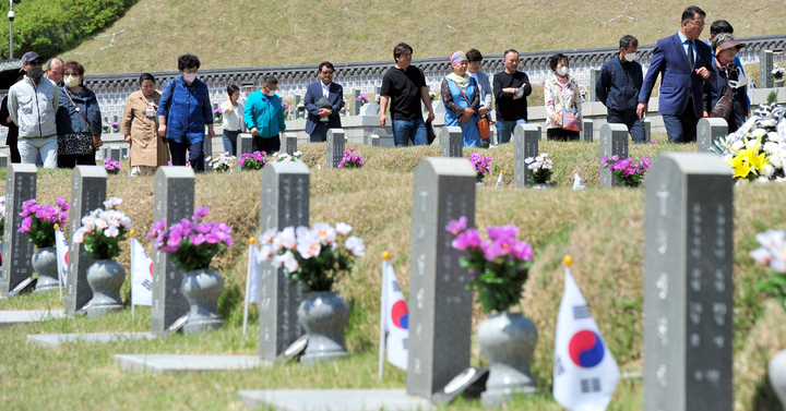 [광주=뉴시스] 이영주 기자 = 5·18민주화운동 42주기를 사흘 앞둔 15일 오전 광주 북구 운정동 국립5·18민주묘지에 참배객들의 발길이 이어지고 있다. 2022.05.15. [email protected]