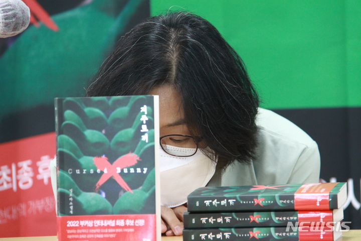 [포항=뉴시스] 이바름 기자 = 16일 오후 2시 경북 포항시청에서 부커상 인터내셔널 부문 최종 후보에 오른 정보라 작가가 기자회견 시작을 기다리고 있다. 2022.05.16. [email protected]