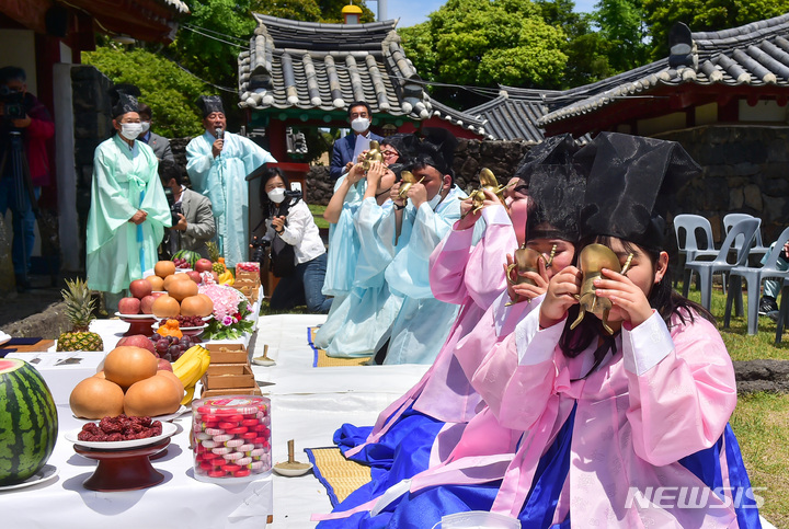 [서귀포=뉴시스] 우장호 기자 = 16일 오전 제주 서귀포시 표선면 정의향교 명륜당에서 '제50회 성년의 날' 기념 전통성년례 재현행사가 열리고 있다. 서귀포시가 주최하고 정의향교가 주관한 이 행사에서는 전통의복인 평상복, 외출복, 예복을 번갈아 입으며 남자인 경우 갓을 씌워주는 관례와 여자인 경우 쪽을 올려 비녀를 꽂는 계례 예식이 재현됐다. 2022.05.16. [email protected]